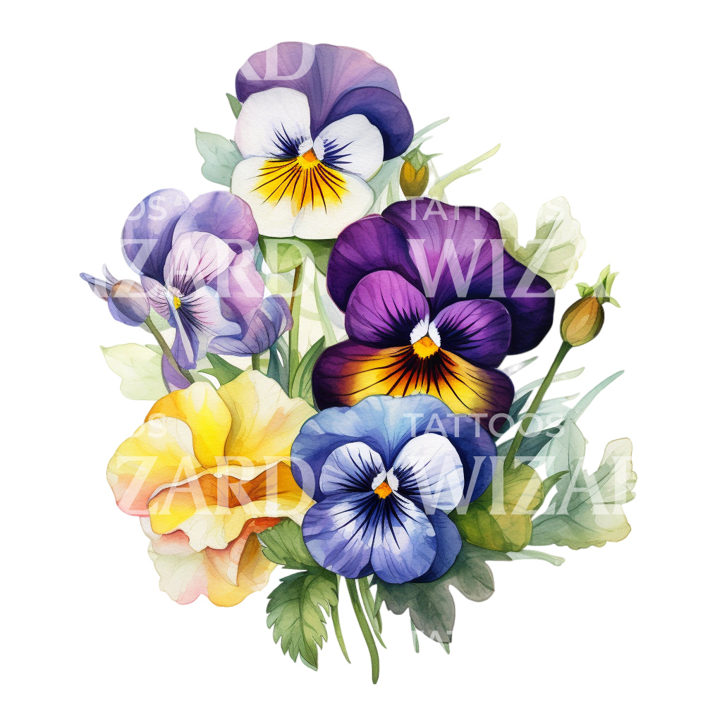 沉浸在我们水彩三色堇纹身设计的细腻魅力中。这件作品将花卉优雅与生动的花束美学融为一体,让您展现对自然的热爱。细腻的轮廓和柔和的水彩效果使其成为您独特表现力的优雅象征。
