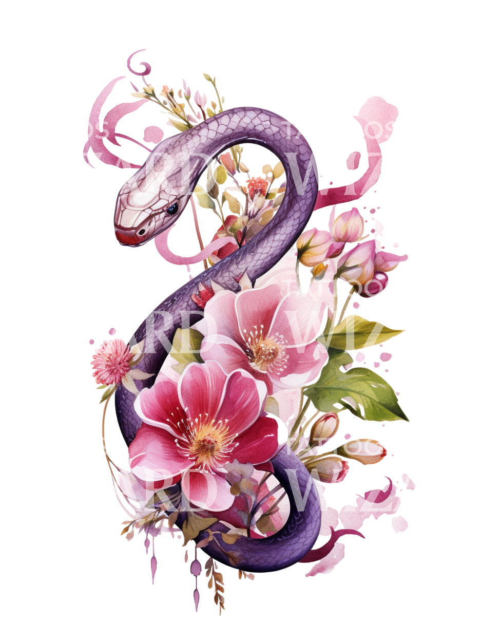 大胆而富有艺术感,这款水彩蛇纹身设计融合了自然的转变和成长的象征。采用鲜艳的色彩和精致的花卉与引人注目的蛇交织在一起。这是一幅充满象征意义的插图杰作,完美适合热爱神秘气息的人。