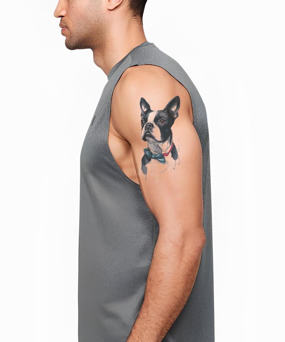 A watercolor terrier portrait, crisp ink lines softened by misty washes and playful paint splatter. The blue bowtie and red collar crown loyal courage with witty elegance, celebrating steadfast companionship. Wearing this design feels like carrying a small guardian of joy, inviting confidence, charm, and heartfelt memories.