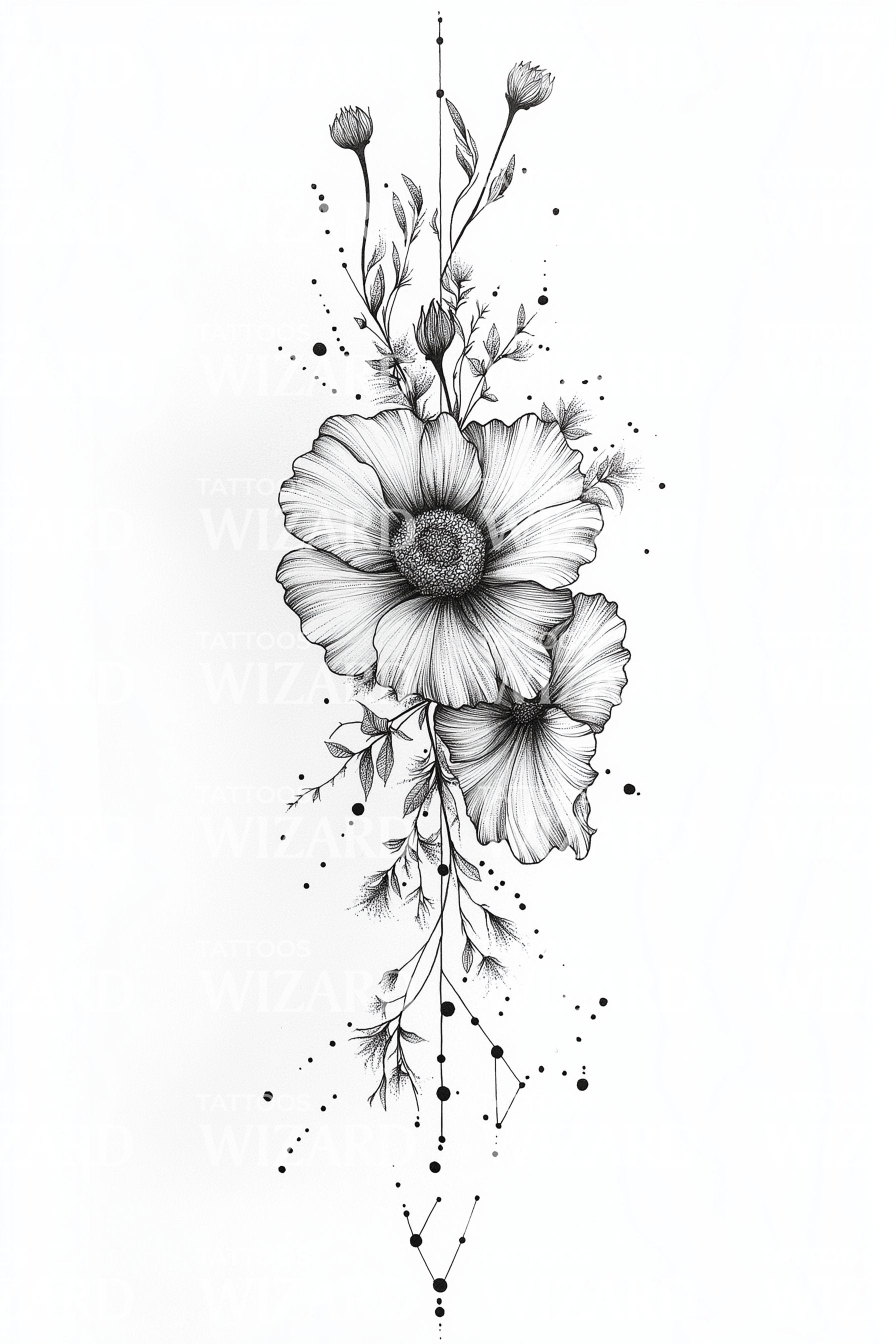 沉浸于大自然的优雅之中,这款细线纹身设计展现了一排垂直排列的野花,拥有细腻的触感,定能吸引植物爱好者。其植物主题以纯粹优美的线条呈现,完美表达你对大地珍宝的热爱。