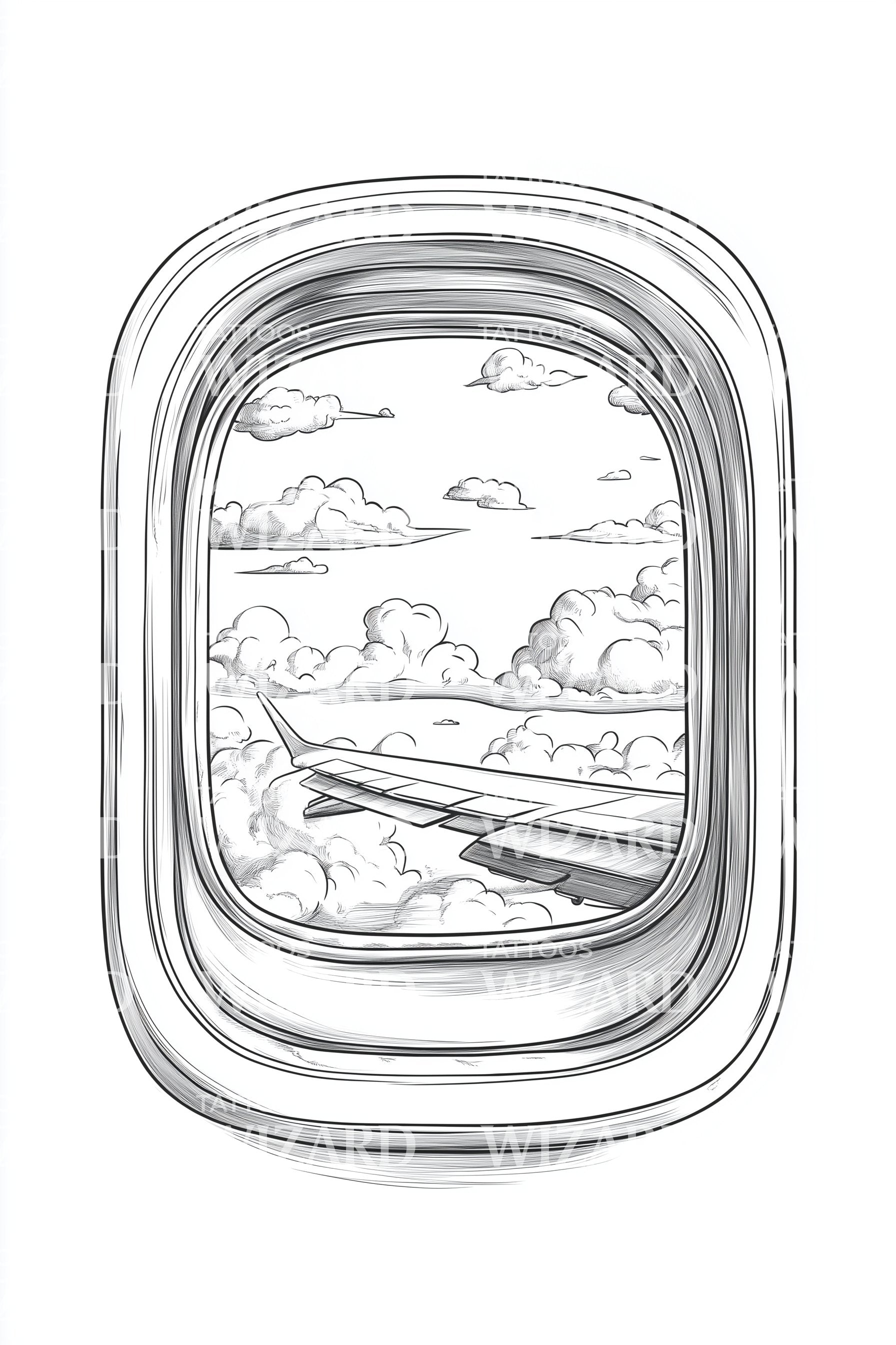一个如窗框般的插画纹身,展现漂浮的云朵、辽阔的天空和远方的风景。干净的线条与柔和的阴影营造出深度与宁静。完美适合旅行者和梦想家,它捕捉了一个静谧的运动瞬间——你的私人视角,提醒你无论何时何地都要不断探索。