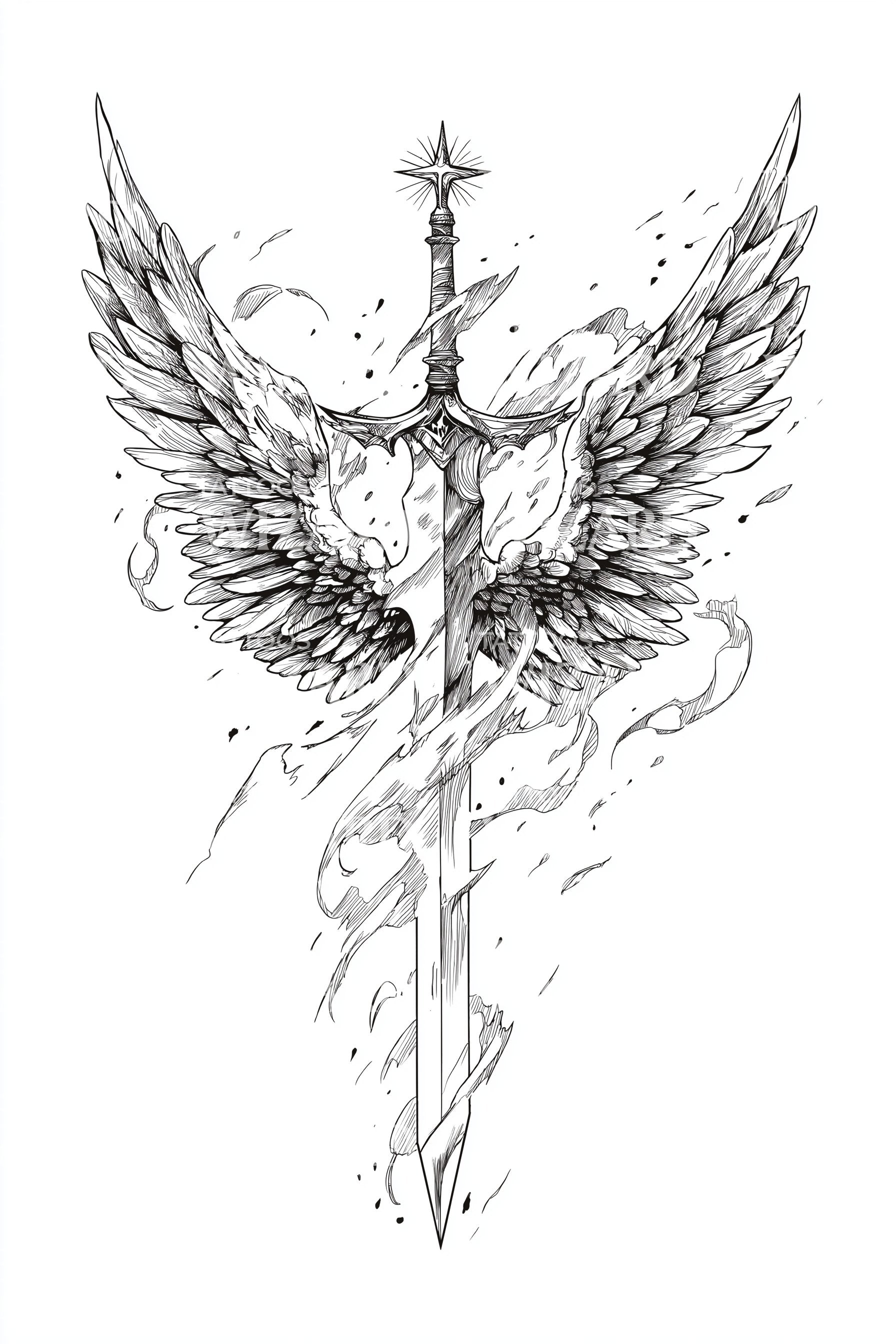 拥抱你的守护灵魂,这款辉煌的纹身设计唤起天界与神圣信仰。艺术作品描绘了一把带翼的剑——神圣保护的象征。精细的细节展现出神圣的威严,营造出令人惊叹的深邃感。在这醒目而神圣的徽章中佩戴你的守护光环。