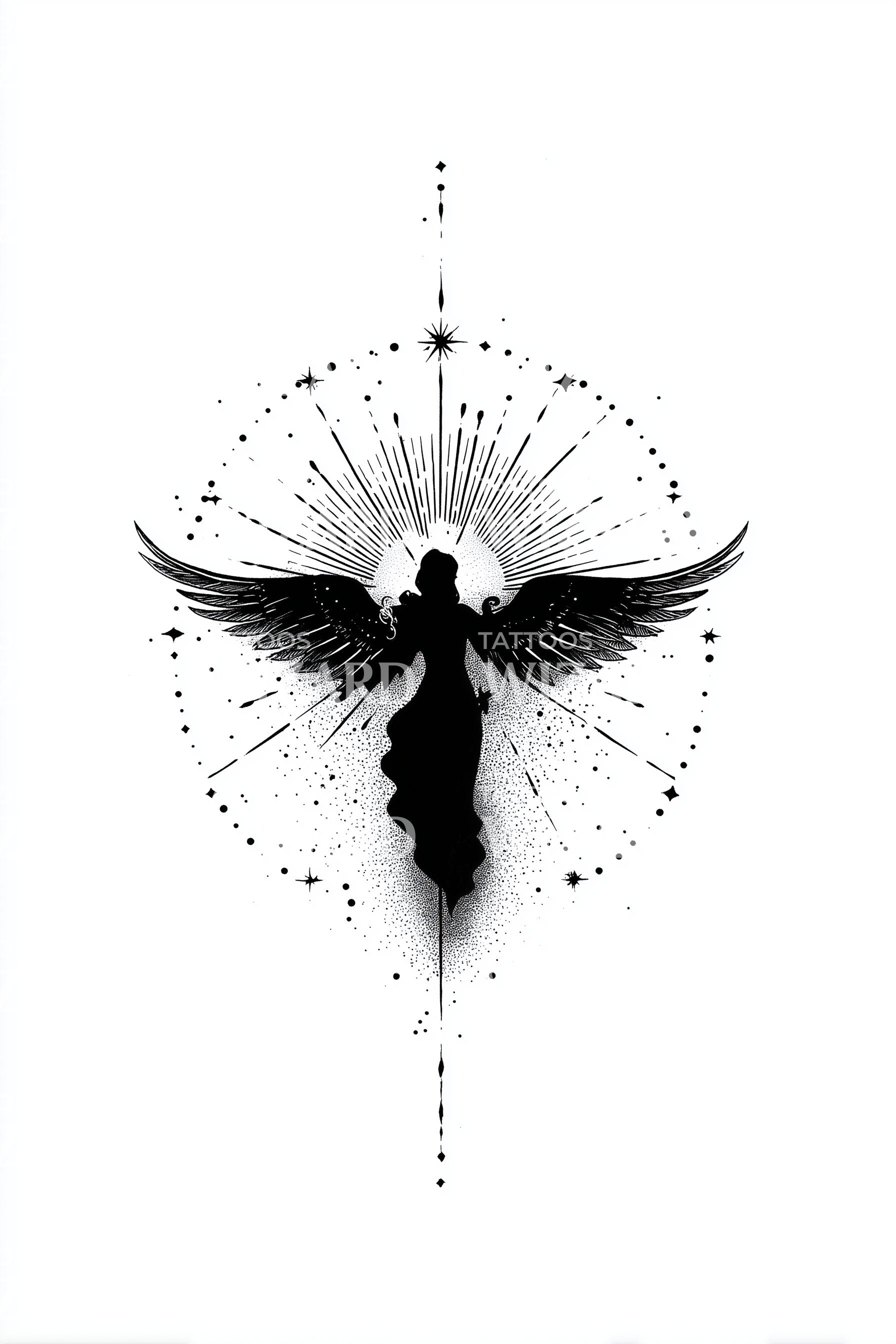 体验这款点描纹身设计中天界魔法的神圣触感。它描绘了一位守护天使,展翅高飞,周围环绕着耀眼的光芒。作为保护与指引的象征,这幅空灵的艺术作品是你肌肤上天国之美的完美体现。