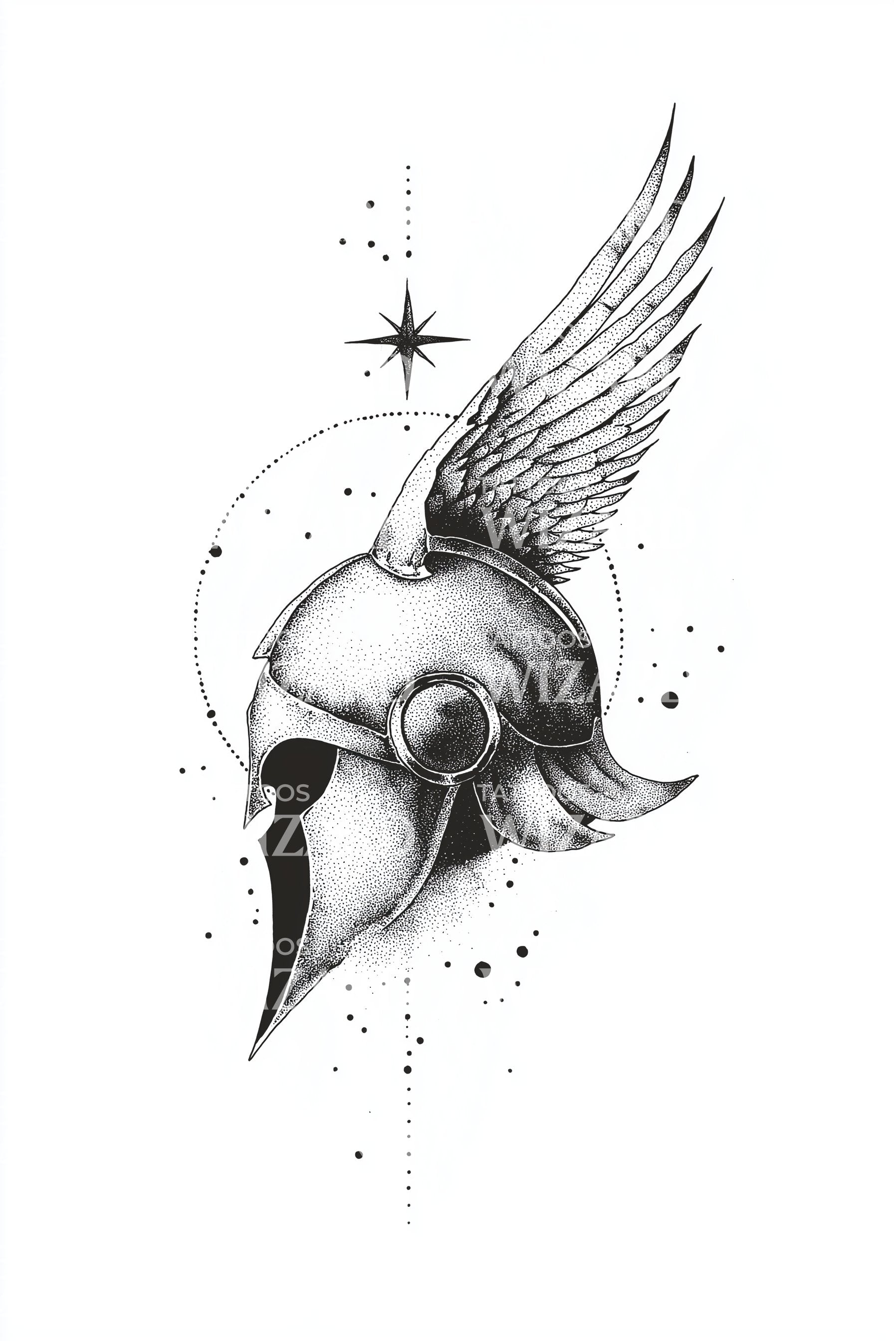 点描风格的有翼头盔,流畅的轮廓由一颗星星和飘散的微粒点缀。北欧战士的力量与守护者的优雅相融合;头盔象征防护,翅膀寓意飞升,星星引领命运。佩戴时,感受坚定与振奋。理想纹身部位:前臂、小腿、肋骨、肩膀,因为每个位置都尊重垂直的流动感。