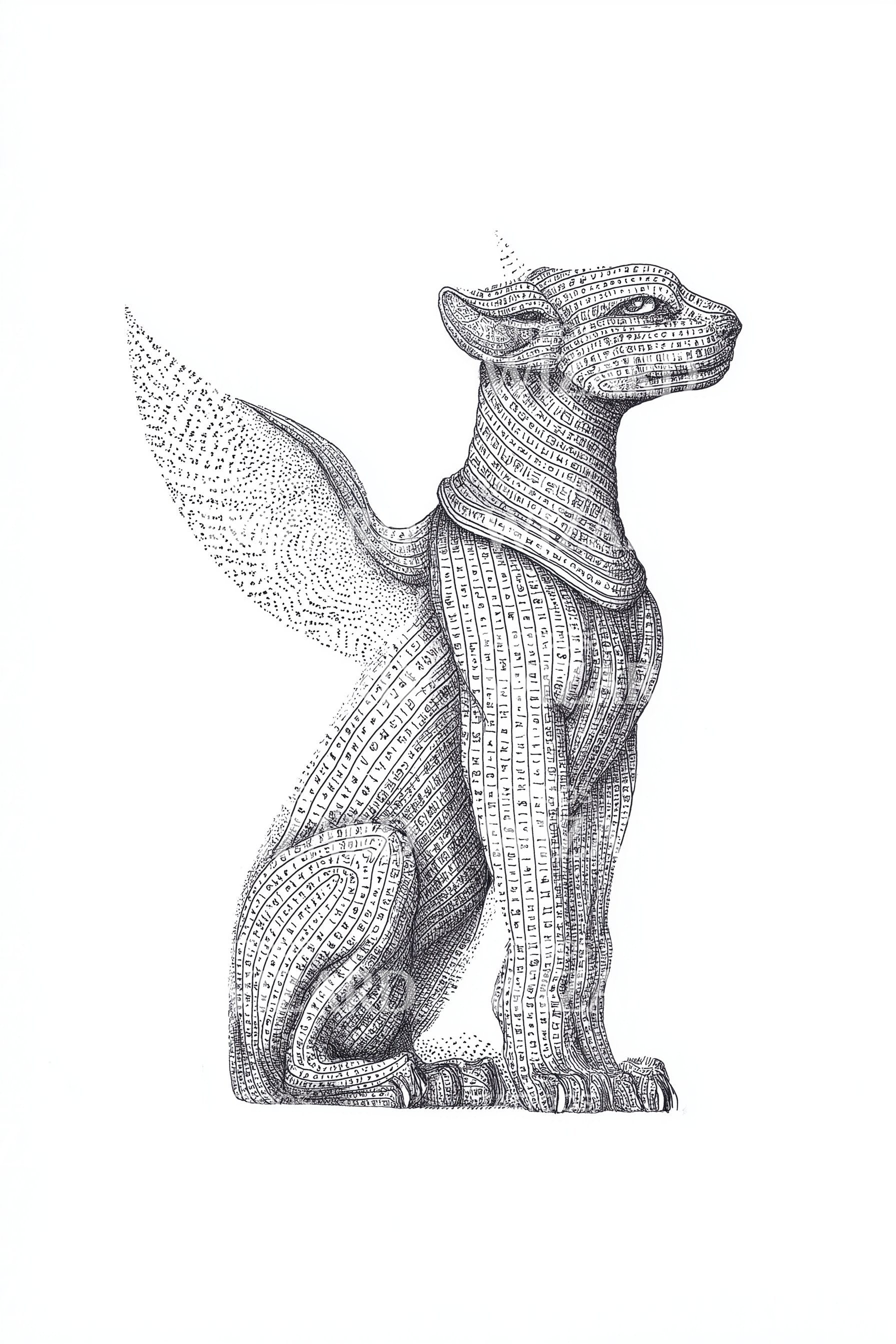 翅膀石犬以细腻的点描技法呈现,宛如一尊静坐的耐心与神话雕像。书法般的纹理雕刻出盔甲线条,翅膀渐渐化为尖点。象征忠诚守护、悲痛化为飞翔与勇气。佩戴如同平静的守护。理想位置为前臂、小腿、肋骨或肩胛骨;垂直流线顺应肌肉,细节得以保留。
