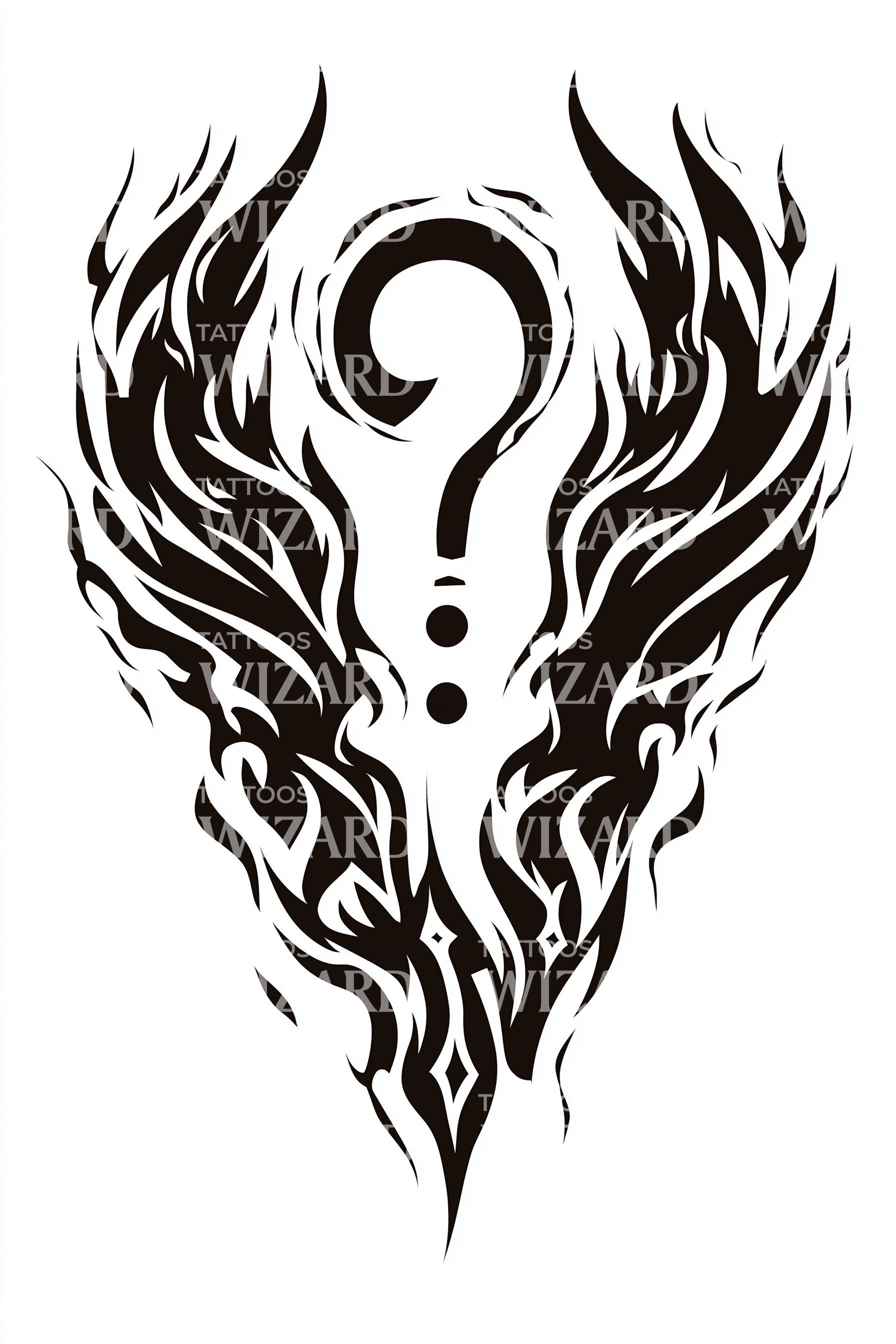 Smoke-black tribal wings flare around a carved question mark, lines feathered like fire and totem sigils. Symbolizes curiosity as a sacred compass, flight through uncertainty, and the courage to transform. Worn, it feels protective, restless, and liberating, a mystery-guide for seekers writing their own myth in living skin.