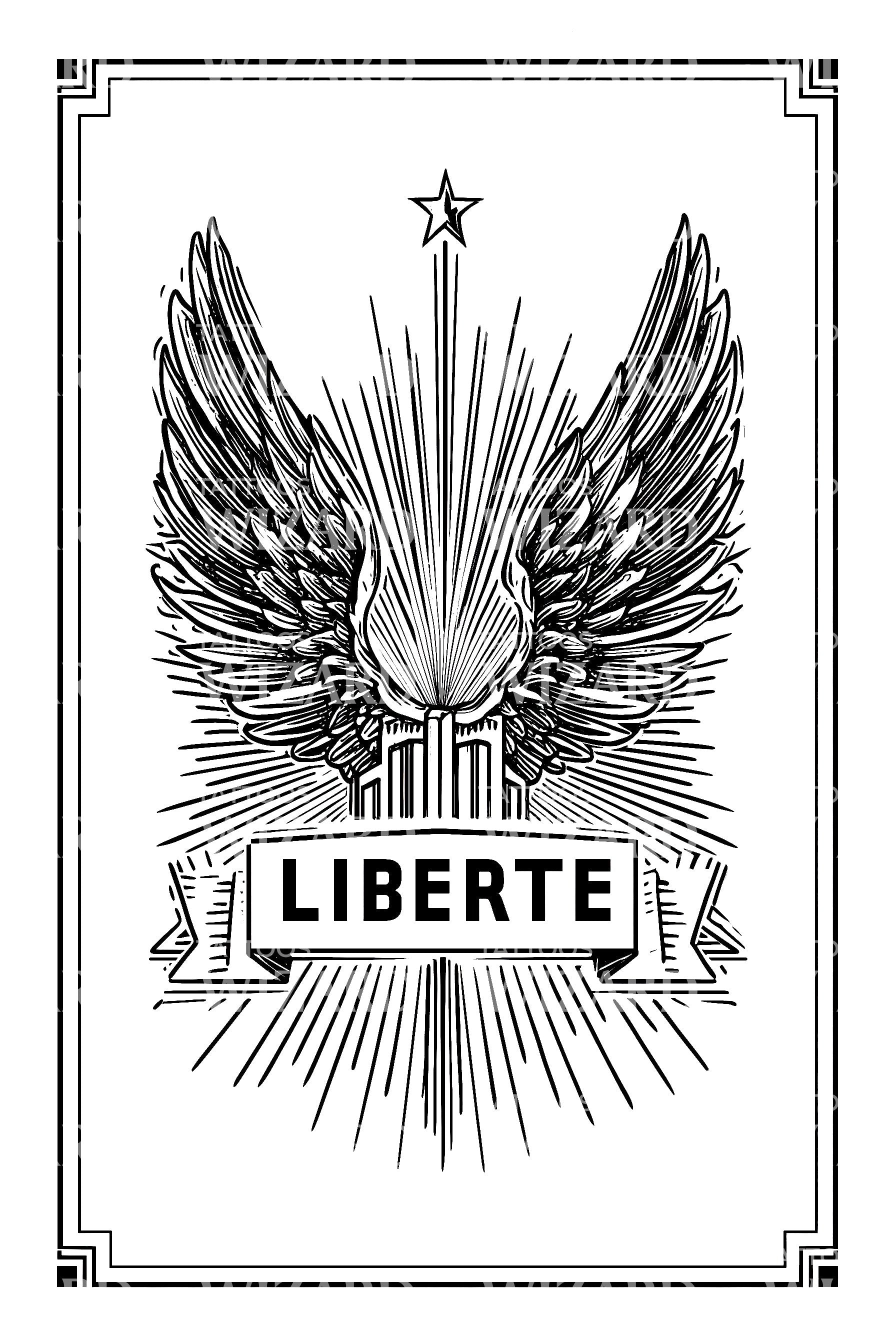 Bold blackwork crest with outstretched wings, radiant rays, and a five-point star crowns a banner reading LIBERTE, rendered in crisp vintage lines. Symbolizes fearless ascent and self-sovereignty, an emblem of freedom earned. Wearing it feels like open sky in your chest, steady, uprising, invincible yet graceful, quietly resolute.