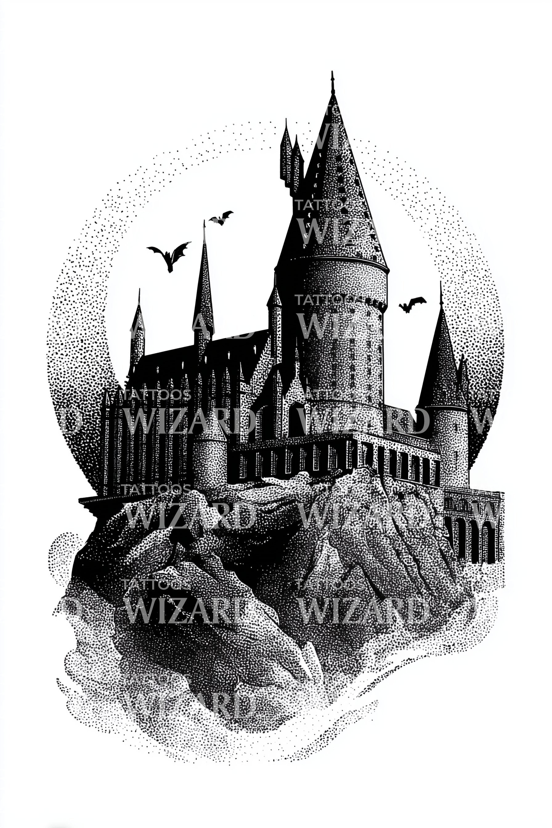 沉浸于这个点描纹身设计所营造的奇幻世界。设计中包含一座如画的城堡、一位神秘的巫师以及魔法学校元素,是对永恒奇幻魅力的惊艳致敬。非常适合热爱魔法与幻象的你,这个设计是艺术与故事讲述的迷人融合。