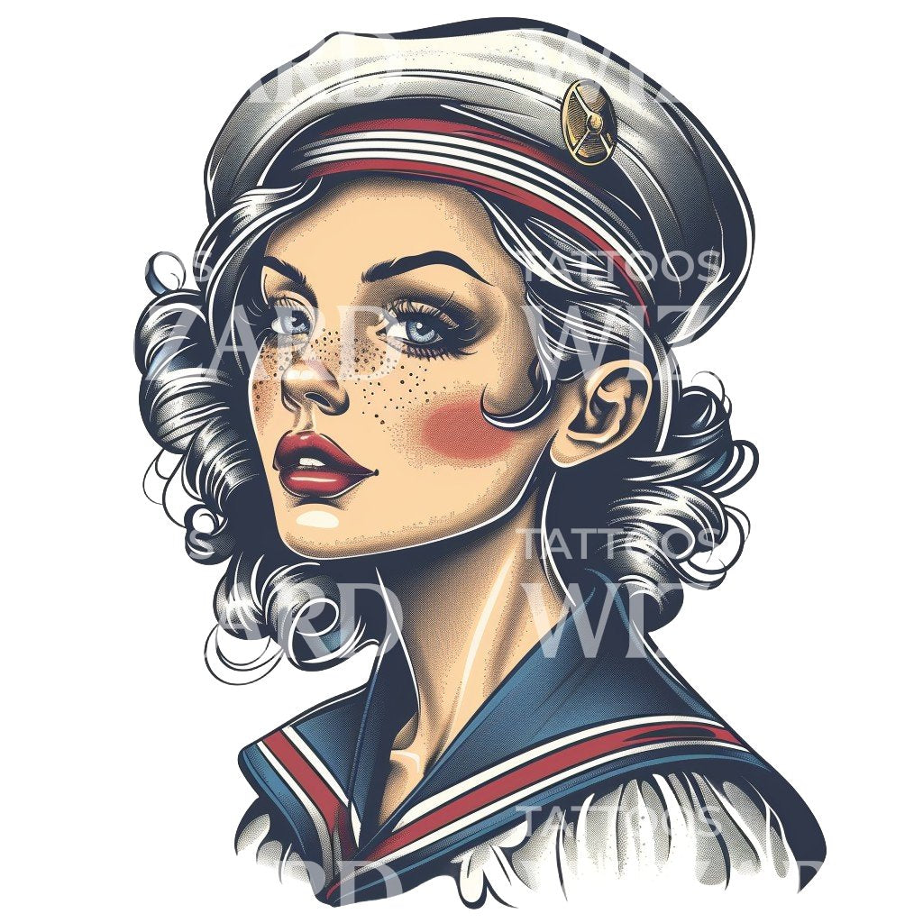 释放你大胆的一面,尽情展现这款充满活力的新传统纹身设计。其引人注目的肖像描绘了一位年轻、满脸雀斑的美人,展现了水手的精神。由才华横溢的纹身艺术家玛丽创作,这件作品融合了传统与现代,彰显了身体艺术的迷人魅力。