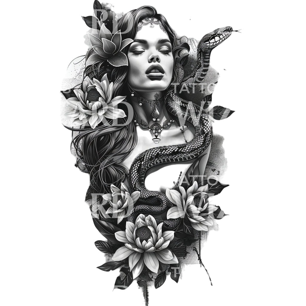 走进我们黑灰色纹身设计的独特魅力,这一设计由纹身艺术家约翰精心绘制。令人惊叹地将美丽的女性、盘绕的蛇和精致的花朵交织在一起,这一设计在每一个草图细节中传达出深度、神秘和优雅。非常适合寻求既美丽又前卫美学的个体。