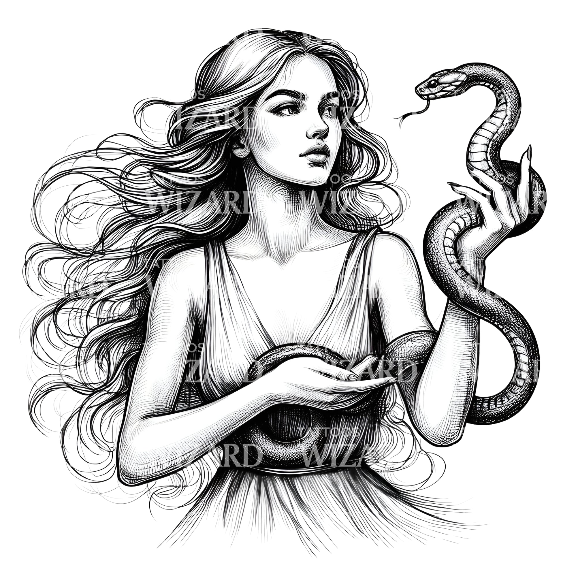 释放你内心狡猾的魅力女神,选择这款装饰性的黑色纹身。缠绕在神秘女性身上的狡猾蛇象征着智慧和重生,而深邃的色调则暗示着你不羁的灵魂。这个设计无疑会与那些与自己阴暗、艺术一面和谐共鸣的人产生共鸣。