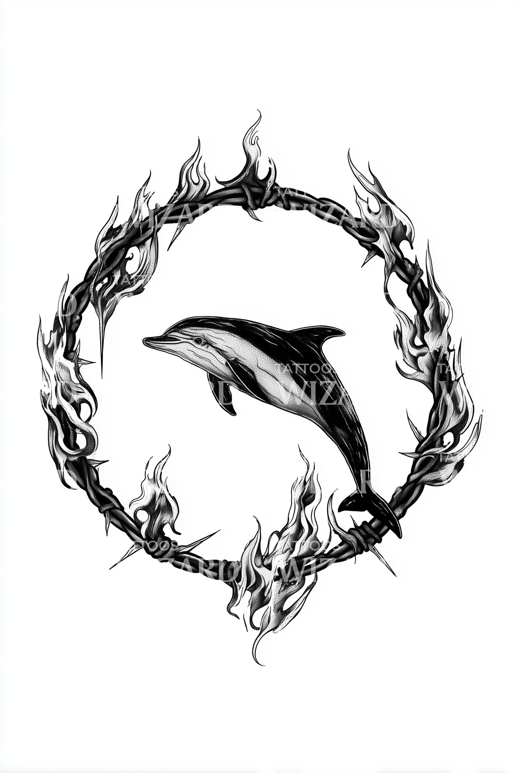 Blackwork contrasts carve a sleek dolphin gliding within a flame-kissed thorn wreath, a stark ring of protection. Ocean grace meets bramble endurance, a symbol of joy guided through trials. Wearing it feels like calm courage: playful heart shielded, tides navigated, resilience circling you with luminous purpose.