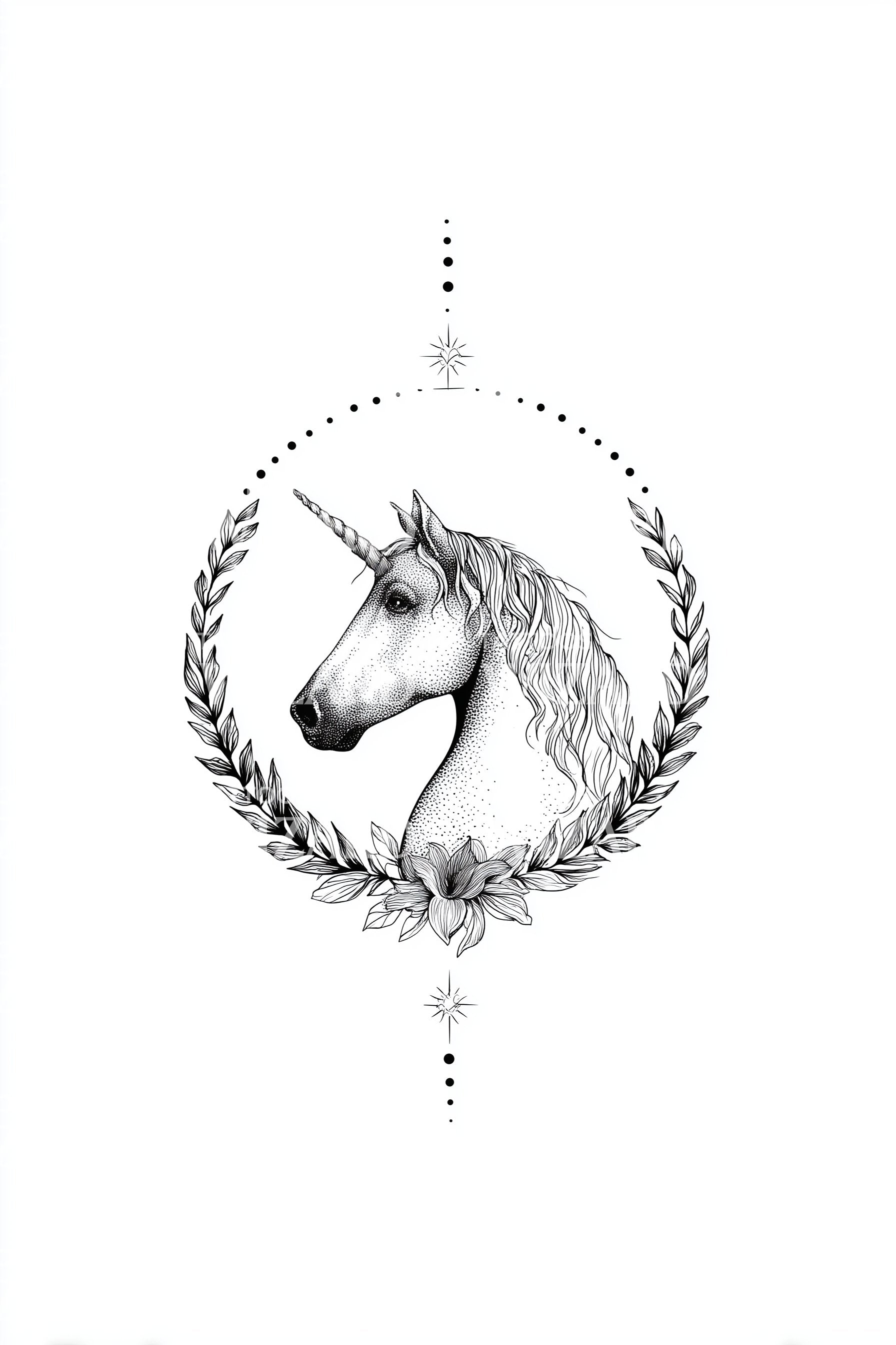 极简纹章:细线条独角兽侧影,头戴月桂花冠和星点弧形,底部由花朵支撑。象征纯洁、勇气与温柔,呈现干净经典的平衡。佩戴如同自信与奇迹。理想位置:胸骨处展现对称,前臂处展现流动感,上背部居中,腿肚处显优雅。