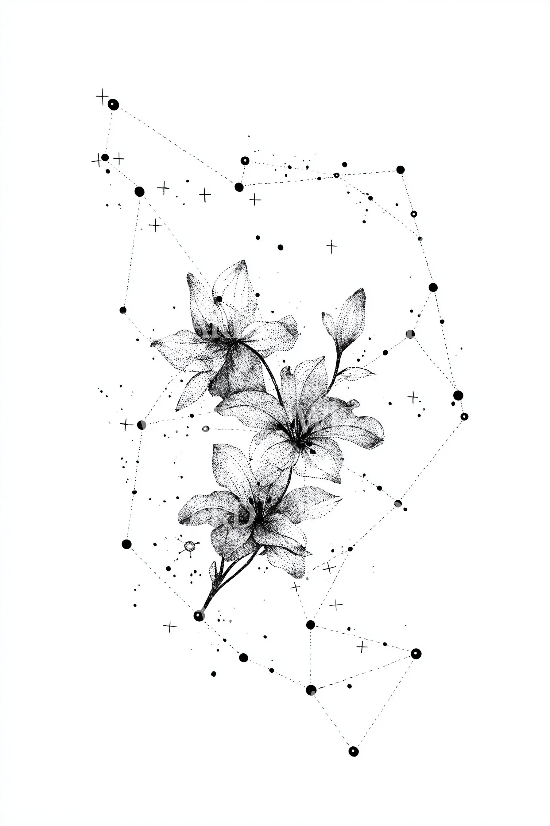 以极简风格拥抱宇宙,这款星座灵感纹身设计融合了精致的线条、花卉点缀和一簇星辰,向你的星座致敬。该设计巧妙地平衡了极简与复杂细节,呈现出独特的天体美学。